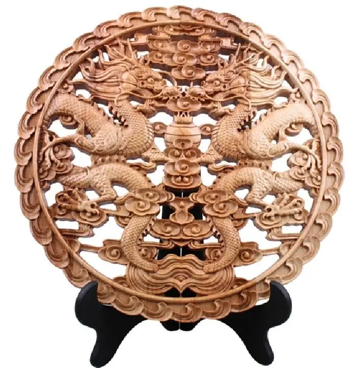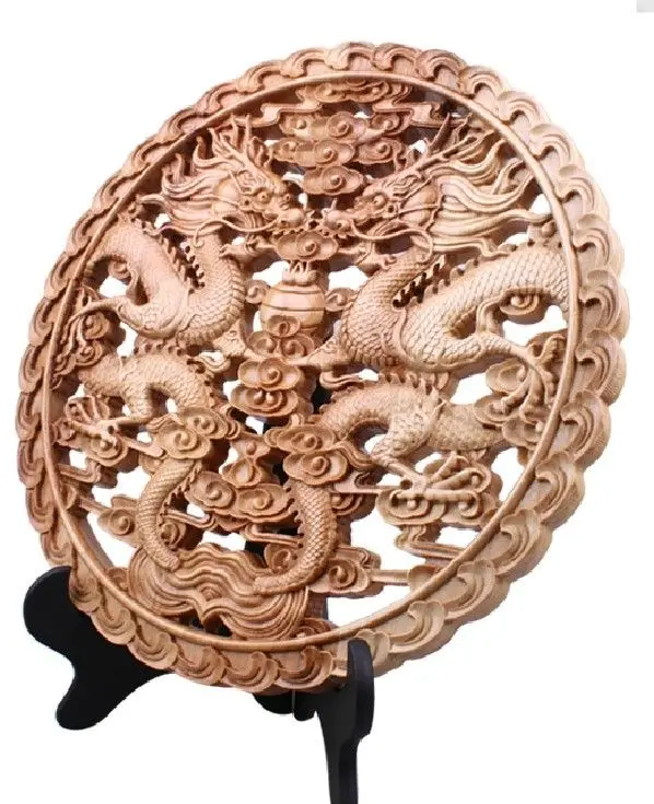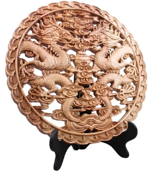 30cm China handwork carved peach wood two dragon wall plate Sculpture statue (D0426)