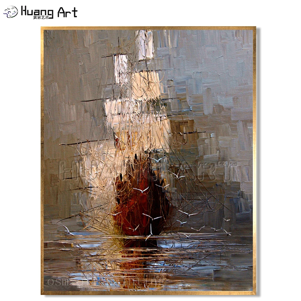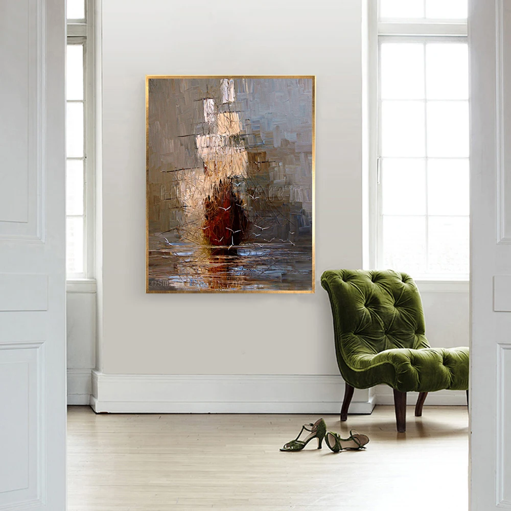 Handmade Modern Abstract Wall Art Landscape Picture Handpainted the Boat in the Sea Sailling Oil Pa